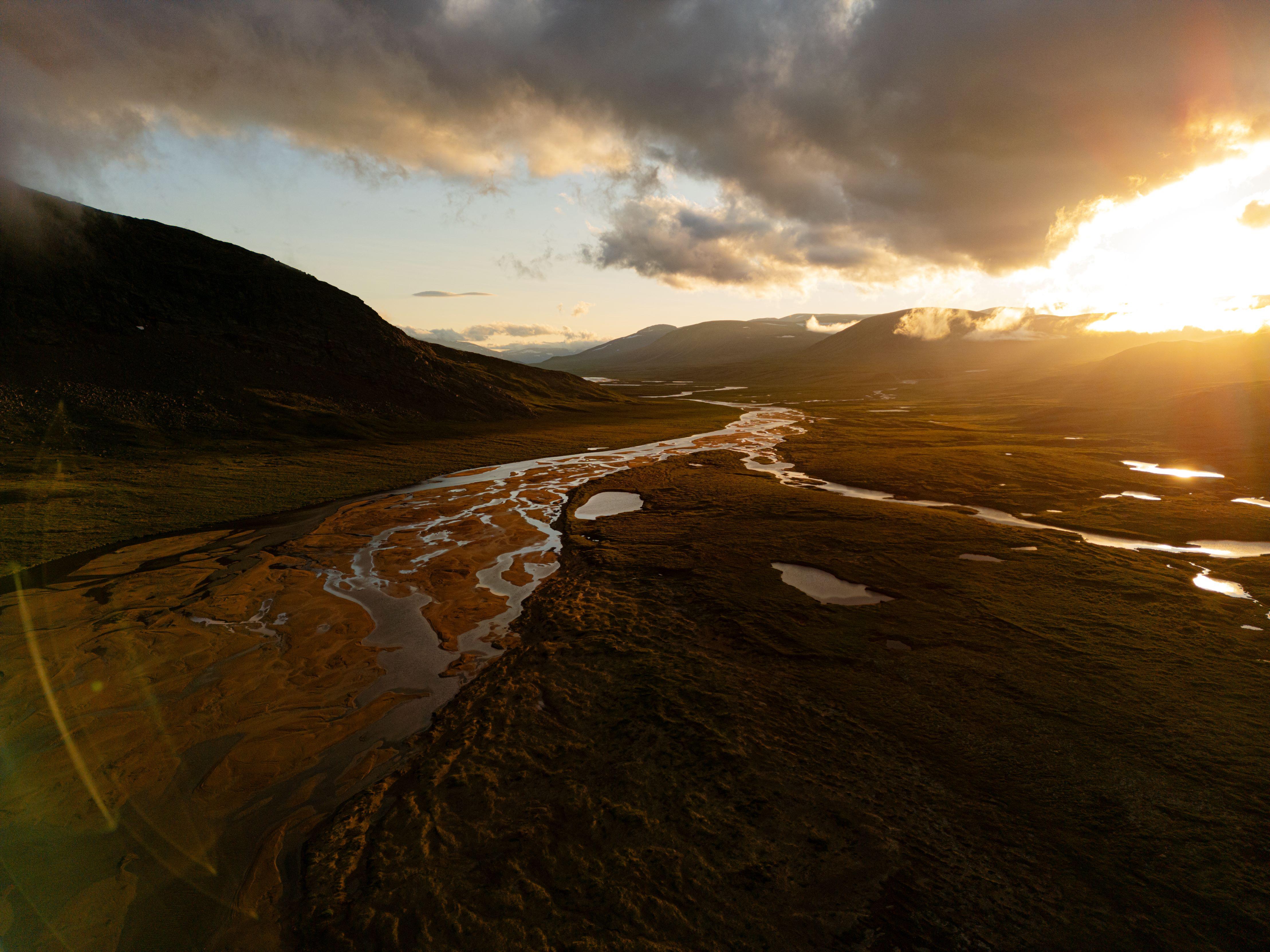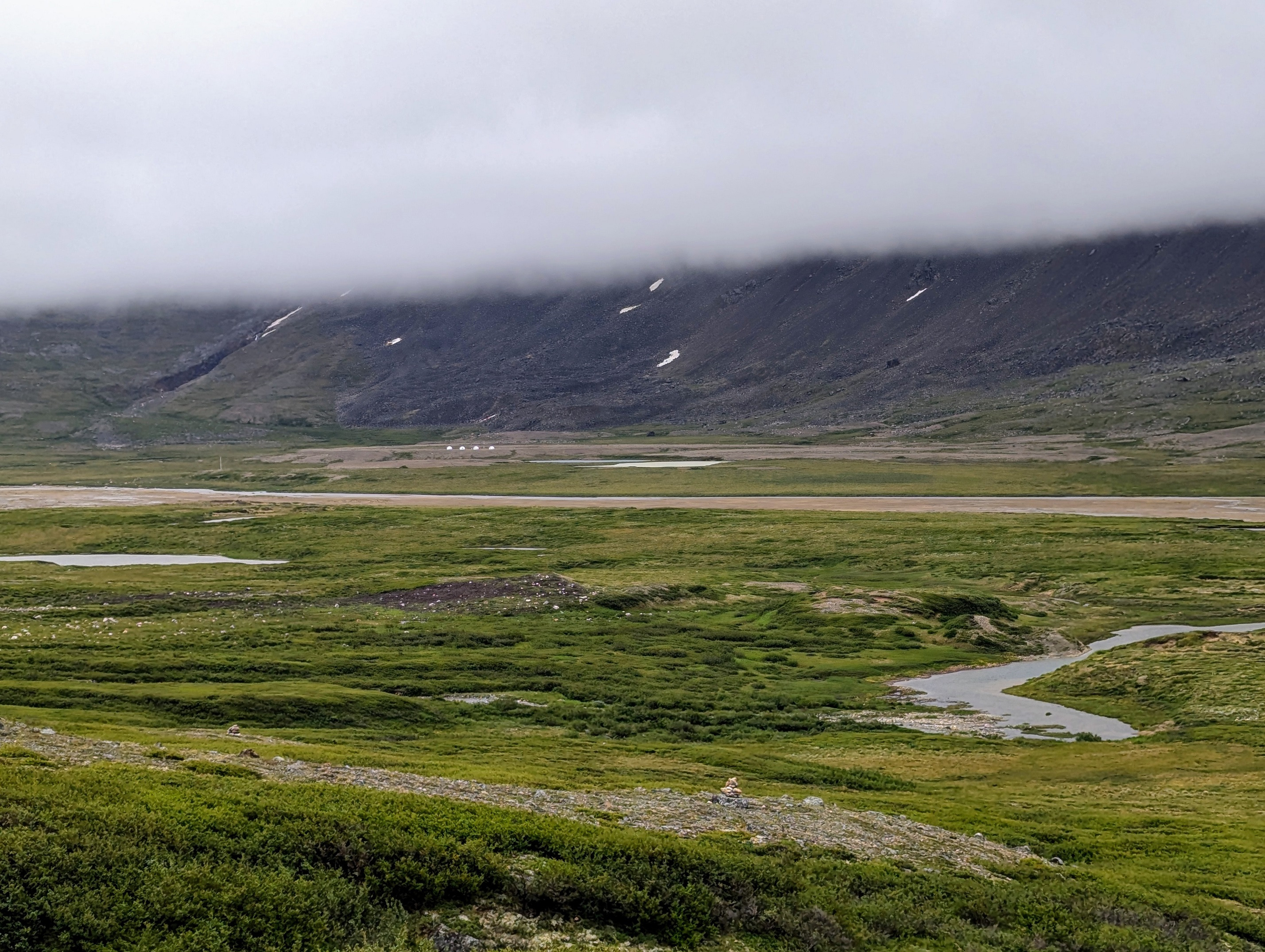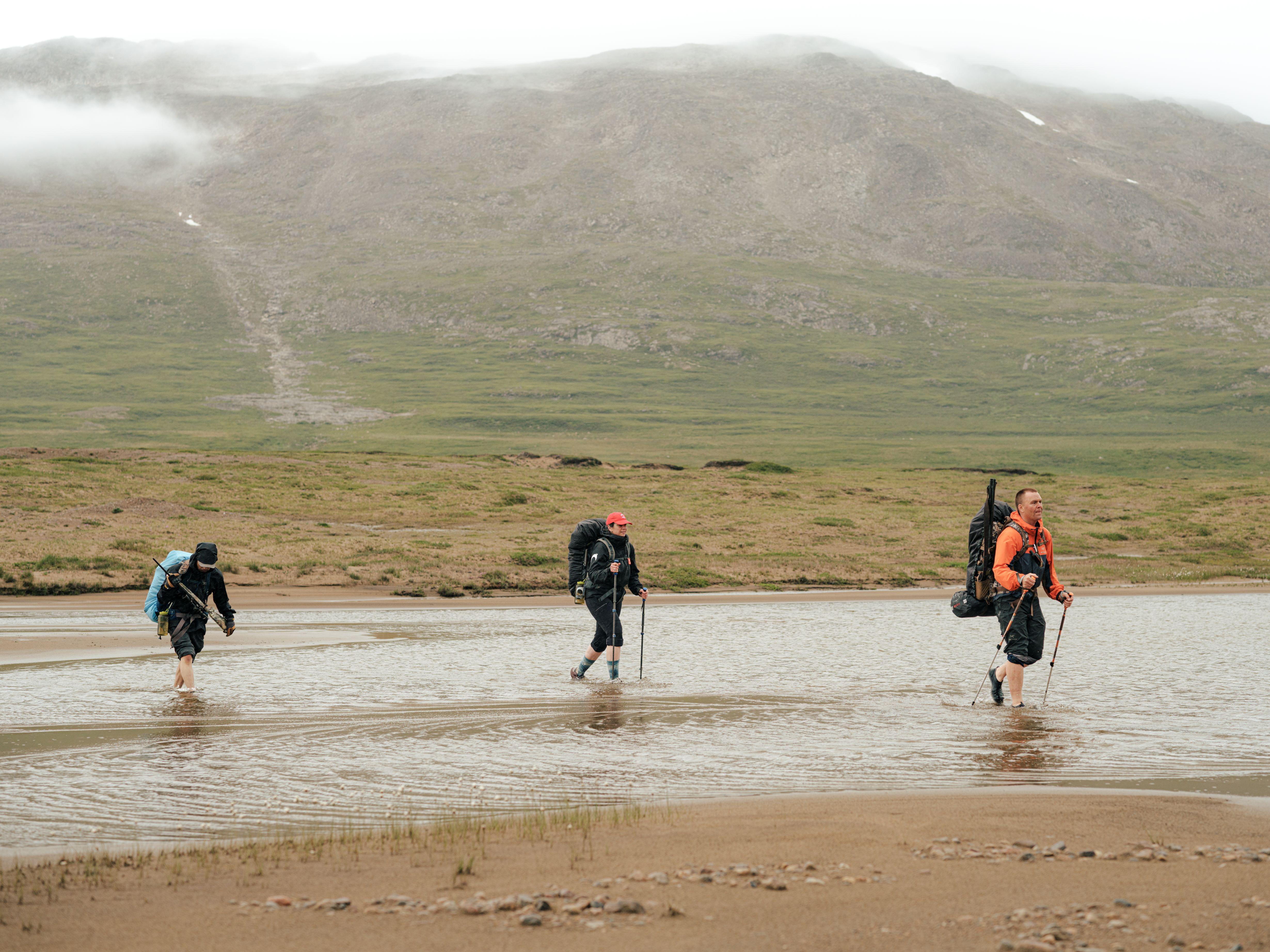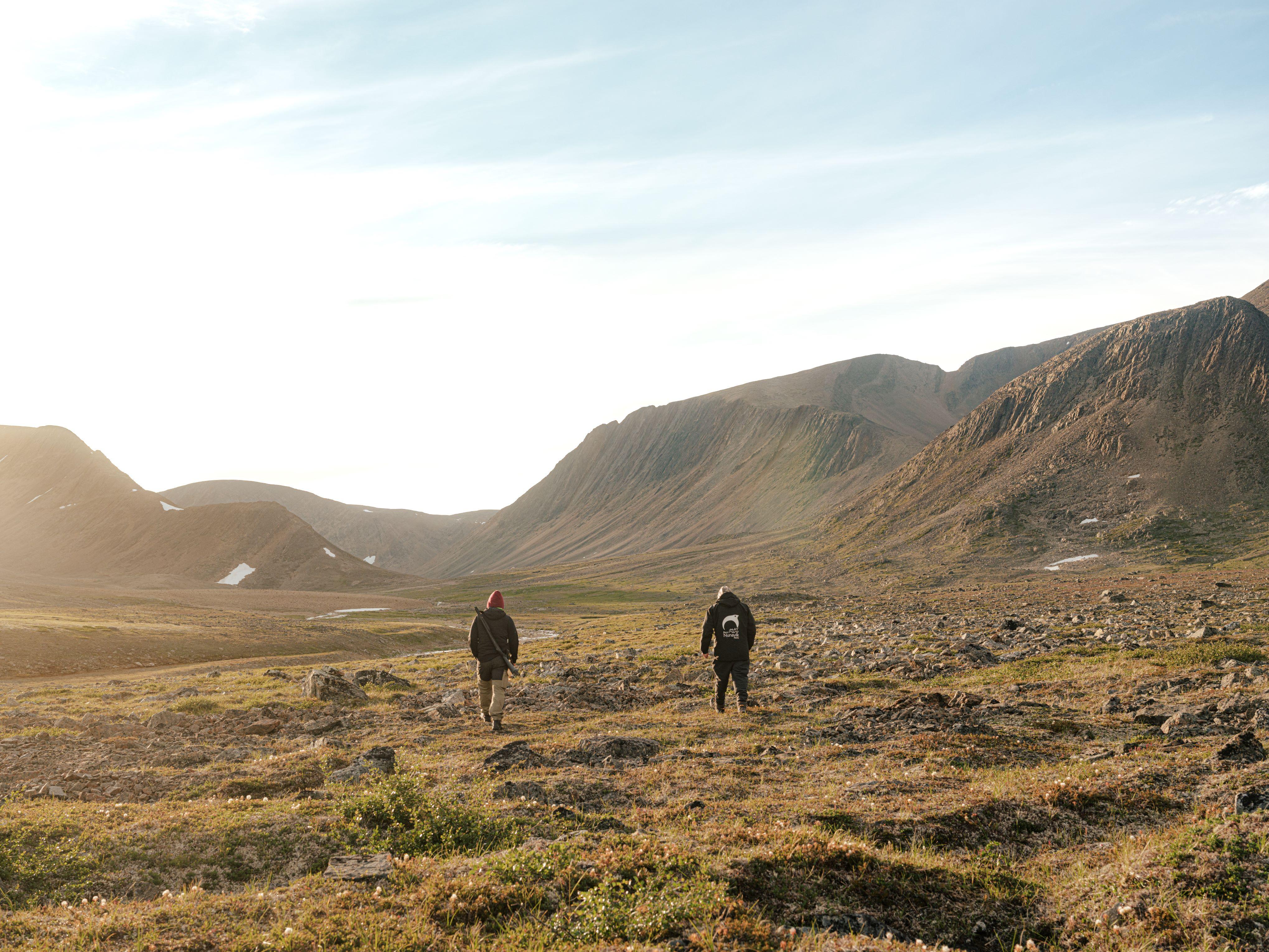 Vous partirez avec votre matériel pour franchir les 12 kilomètres qui vous séparent du camp de base. Vous suivrez la vallée qui se rend jusqu'au pied du mont Kauvvik (mont D'Iberville) où vous pourrez vous installer pour les jours suivants. Vous vous rendrez en suivant de petits ruisseaux et en marchant parmi des montagnes qui s'élèvent de plus en plus haut à mesure que vous approchez du secteur de Kauvvik. Vous aurez le temps de poursuivre votre exploration des lieux et d'apprécier le sentiment de liberté qui s'en dégage.