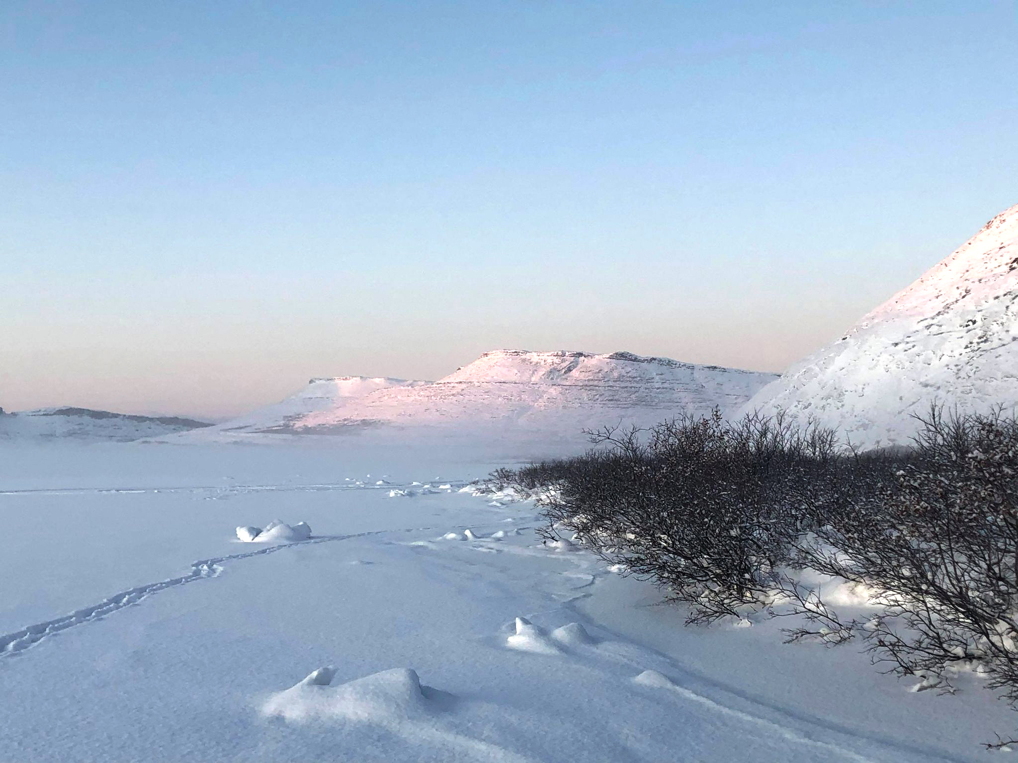 Après le déjeuner et le nettoyage du camp, vous retournerez en ski à Umiujaq sur un parcours d’environ 20 kilomètres à travers le secteur prisé des Deux Lacs. Cette vallée, très appréciée des locaux pour la pêche et la cueillette, attire également les visiteur.euse.s grâce à sa vue exceptionnelle sur les lacs et la baie d’Hudson, en été comme en hiver.