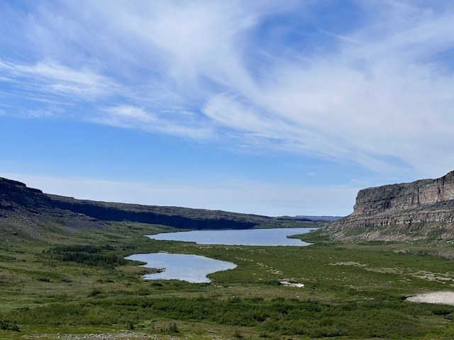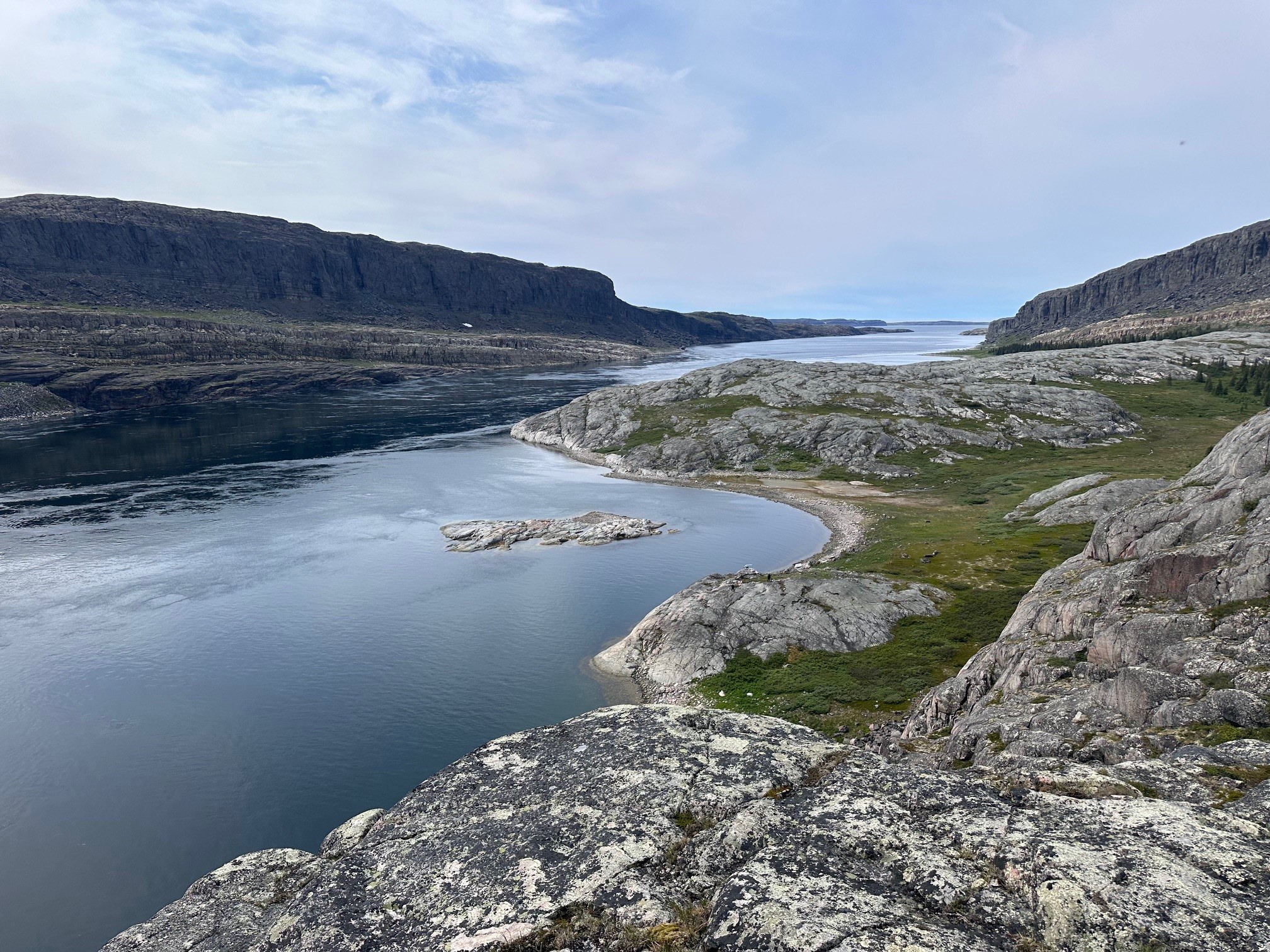Si le temps le permet, l'île Cairn sera une autre destination. Au 19e siècle, elle accueillait un poste de traite et de forgerons de la Compagnie de la Baie d'Hudson (les vestiges sont aujourd'hui disparus). L'île est magnifique, vous pourrez en profiter en vous y promenant et ainsi admirer les cuestas encerclant le lac.