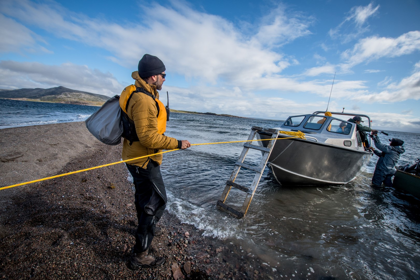 Après le petit déjeuner, vous partirez en expédition d'environ une heure en bateau qui vous fera longer la baie d'Hudson. Vous aurez la chance de découvrir la majestueuse chute Nastapoka et son impressionnante plage de sable où vous passerez la journée. Ce site, connu des Inuit depuis des générations, est un lieu privilégié pour l’observation de mammifères marins et terrestres. Pour vous y rendre, vous voguerez entre les paysages des îles Gillies et les imposantes cuestas hudsoniennes longeant la côte. Une fois à l’embouchure de la rivière Nastapoka, pique-nique, feu de camp, pêche, baignade et courte randonnée vers la chute seront au programme. Vous reviendrez pour le souper à Umiujuaq où vous passerez la nuit.